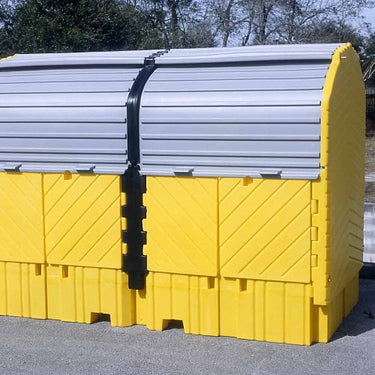 OUTDOOR STORAGE FOR TWO IBCS: Dual-tank hard top containment keeps IBCs secure while capturing leaks in a shared containment sump.