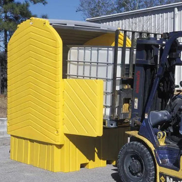 OUTDOOR IBC STORAGE WITH CONTAINMENT: Hard top enclosure supports compliant outdoor storage and helps control leaks beneath IBCs.