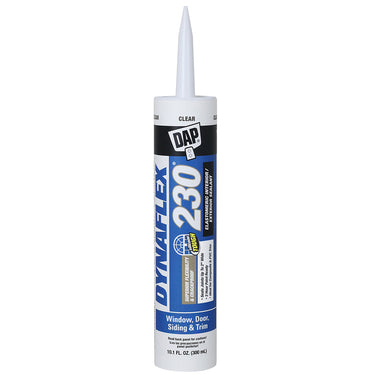 DAP Dynaflex 230 is a premium elastomeric latex sealant offering silicone tough performance with paintability. It forms a 100 percent waterproof, weatherproof seal and meets ASTM C920 Class 25 for joint movement. Use around windows, doors, siding, trim and baseboards where durability and flexibility are required. 10.1 oz cartridge in clear. SKU 18305.