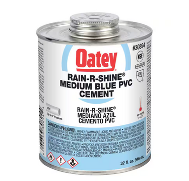 Oatey PVC Rain-R-Shine Medium Bodied Fast Set Blue Cement is recommended for pool and spa, irrigation, potable water, pressure pipe and DWV applications. It is formulated for wet conditions and quick pressurization, and is easy to apply with included in-lid dauber. This blue, medium bodied, fast set cement can be used to solvent weld all schedules and classes of PVC pipe and fittings up to 6 in. diameter with interference fit. Oatey products have earned the trust of plumbing professionals for over 100 years.